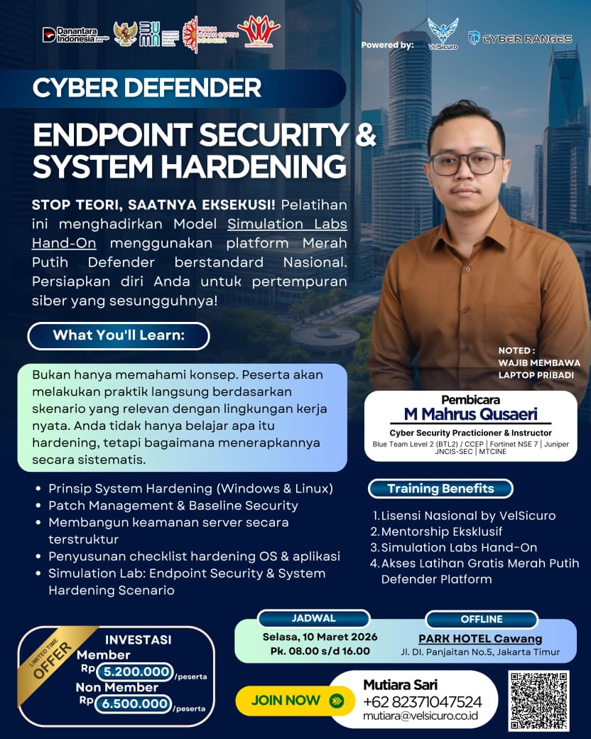 Dirancang untuk profesional IT yang ingin memastikan sistem benar-benar siap menghadapi risiko. Peserta tidak hanya memahami konsep, tetapi langsung praktik melalui skenario yang relevan dengan lingkungan kerja nyata.